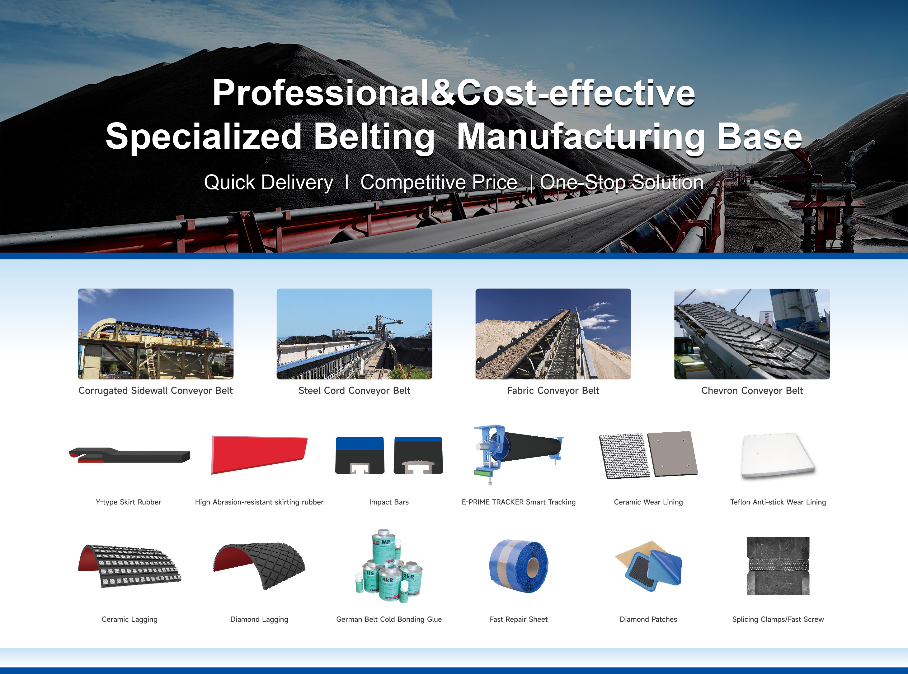 QBF anti-stick conveyor belts are suitable for wet and sticky material transportation such as silt, chemical powder, clay, gypsum and wet coal in tunneling, metallurgy, chemical and mining industries. The anti-stick design is available for sidewall conveyor belts, steel cord conveyor belts, fabric conveyor belts as well as those used for food grade applications.