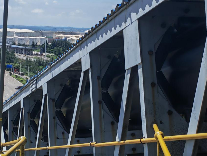 Pipe conveyor belts are used for enclosed material transport. The belt is rolled into a pipe shape containing materials inside with a limited environment impact during operation. It is capable of negotiating steep inclines as well as tighter curves.